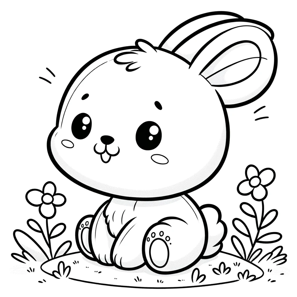 Eine einfache, fröhliche Malvorlage mit einem entzückenden Hasen, umgeben von kleinen Blumen.