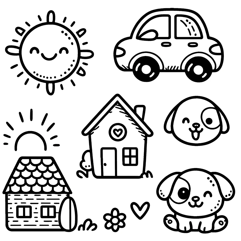 Dieses bezaubernde Ausmalbild zeigt eine Sammlung kleiner, niedlicher Zeichnungen, die perfekt für kleine Kinder sind. Das Bild enthält eine fröhliche Sonne, ein süßes Auto, zwei gemütliche Häuser und zwei verspielte Welpen, jeweils mit einfachen, einladenden Linien.