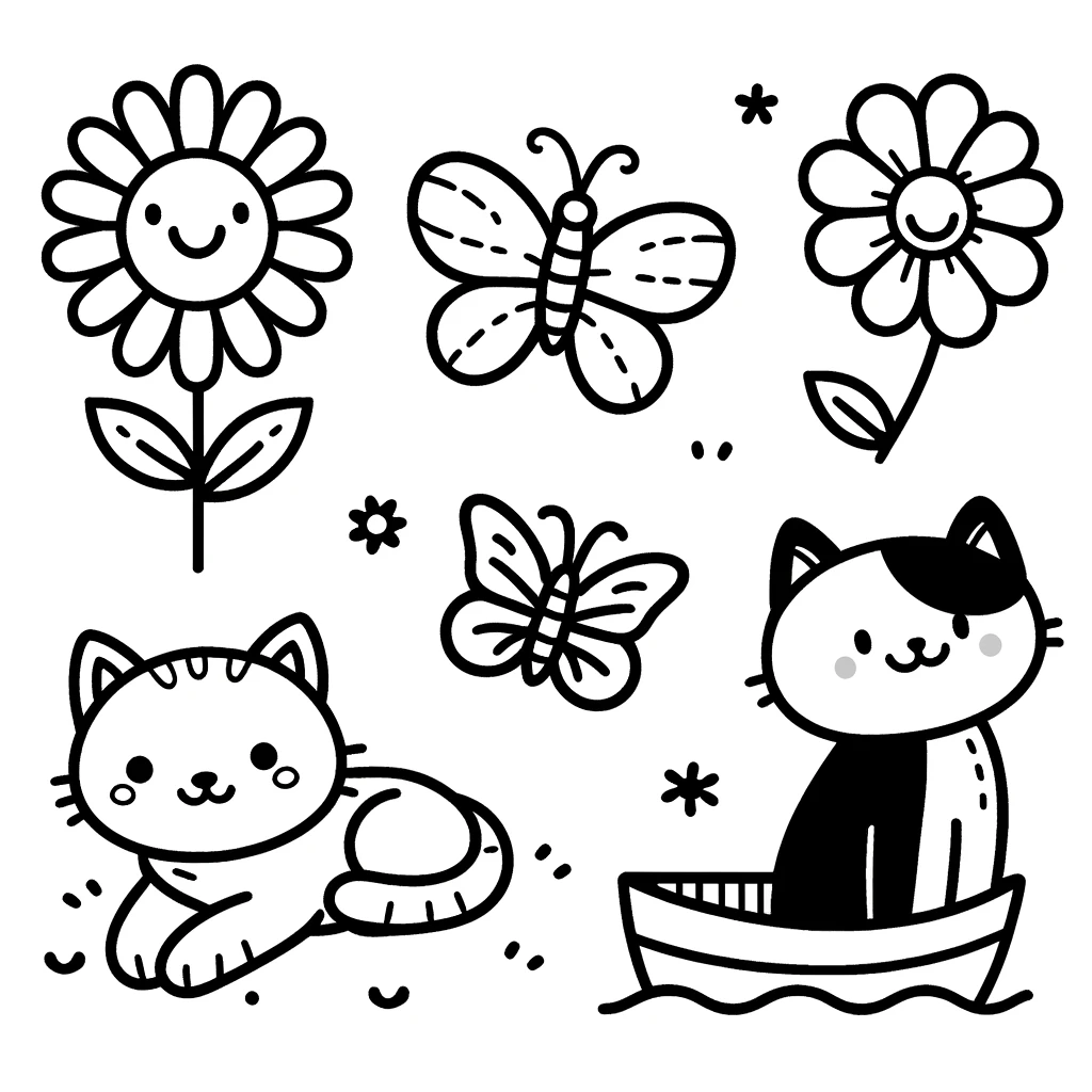 Dieses bezaubernde Ausmalbild zeigt eine Vielzahl von lustigen und niedlichen naturbezogenen Illustrationen. Das Bild enthält zwei lächelnde Blumen, ein Paar spielerische Schmetterlinge und zwei entzückende Katzen, eine, die auf dem Boden liegt, und die andere, die in einem Boot sitzt.