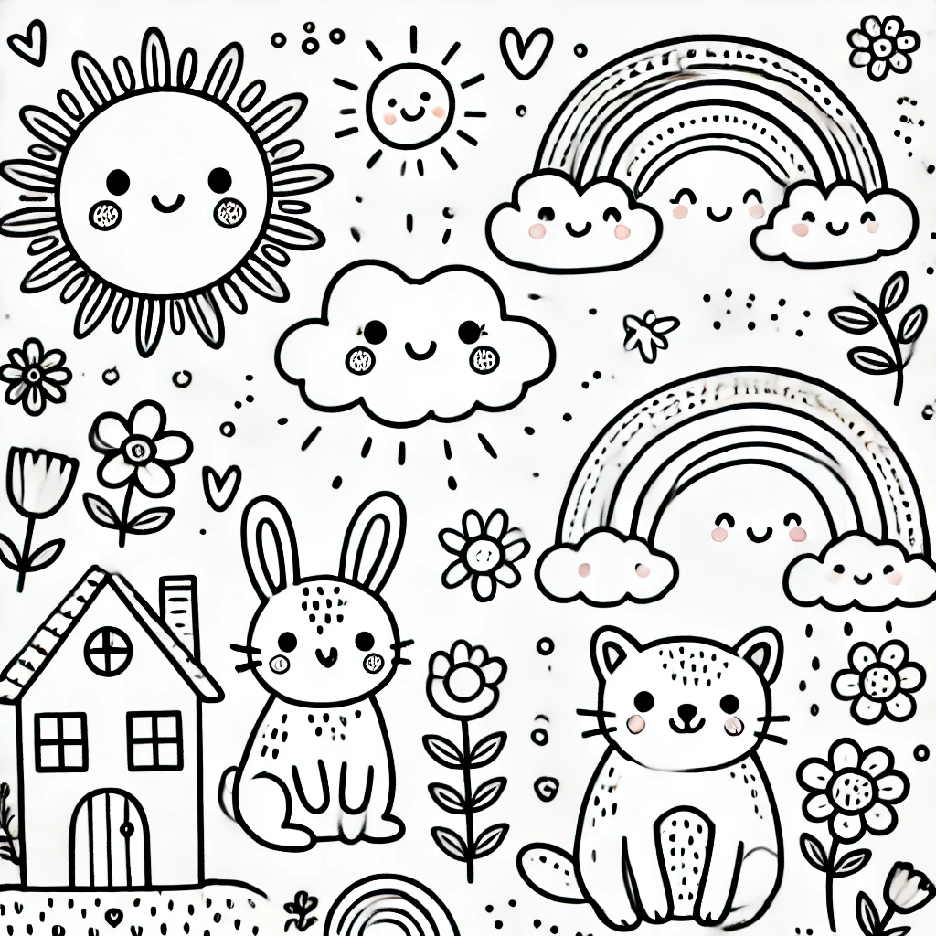 Dieses bezaubernde Ausmalbild zeigt eine fröhliche Szene voller heiterer Elemente. Lachende Sonnen, glückliche Wolken und spielerische Regenbögen sind über die Seite verteilt, neben einem kleinen Haus und blühenden Blumen.