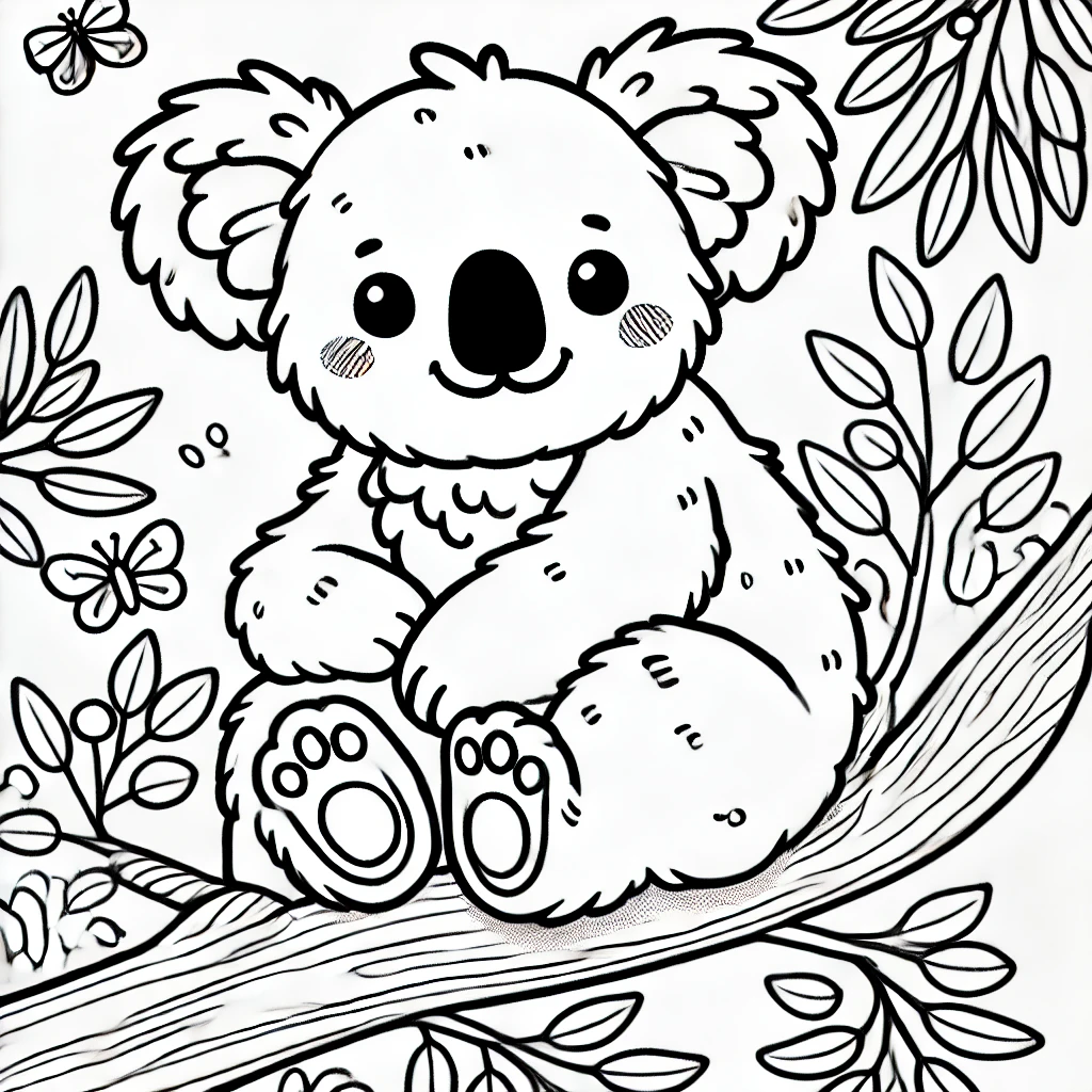 Dieses niedliche Ausmalbild zeigt einen fröhlichen Koala, der gemütlich auf einem Baumzweig sitzt, umgeben von Blättern und Schmetterlingen.