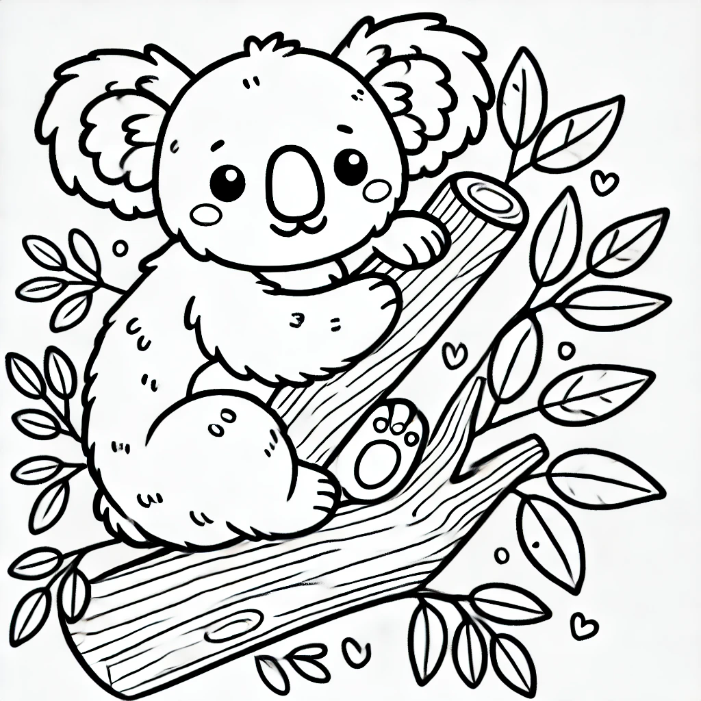 Auf diesem niedlichen Ausmalbild klammert sich ein süßer Koala an einen Eukalyptuszweig, umgeben von Blättern und kleinen Herzen.