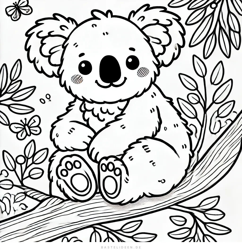 Dieses niedliche Ausmalbild zeigt einen fröhlichen Koala, der gemütlich auf einem Baumzweig sitzt, umgeben von Blättern und Schmetterlingen.