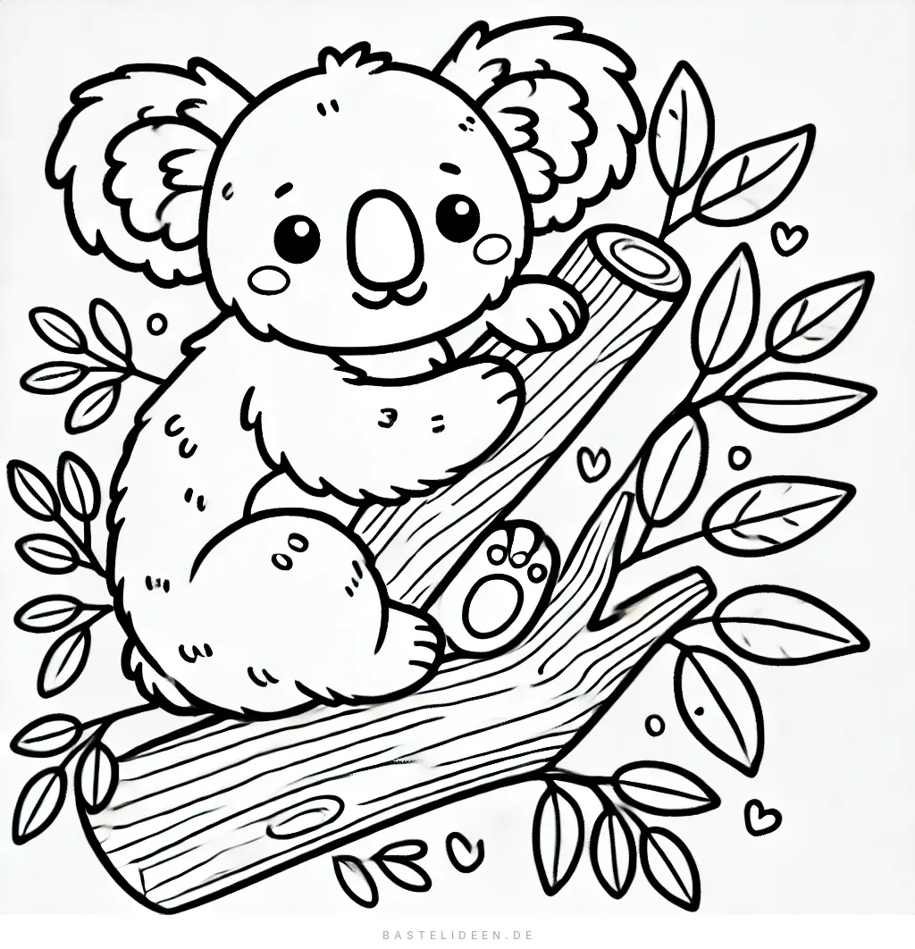 Auf diesem niedlichen Ausmalbild klammert sich ein süßer Koala an einen Eukalyptuszweig, umgeben von Blättern und kleinen Herzen.