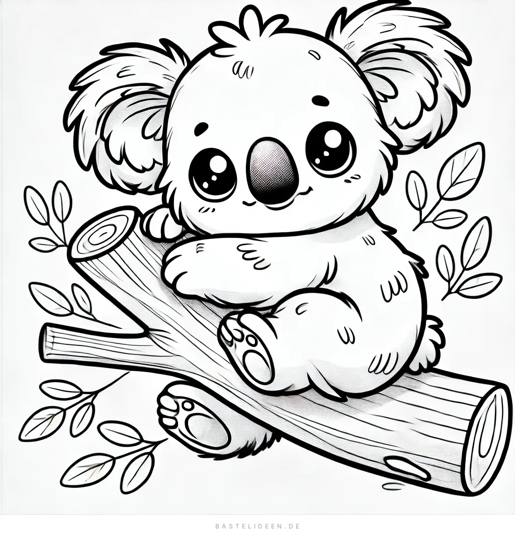 Dieser niedliche Baby-Koala sitzt gemütlich auf einem Ast und verzaubert mit seinen großen runden Augen und flauschigen Ohren. Mit seinem verspielten Ausdruck und den weichen Details ist dieses Ausmalbild perfekt für Kinder und Erwachsene, die Koalas lieben und gerne kreativ werden.