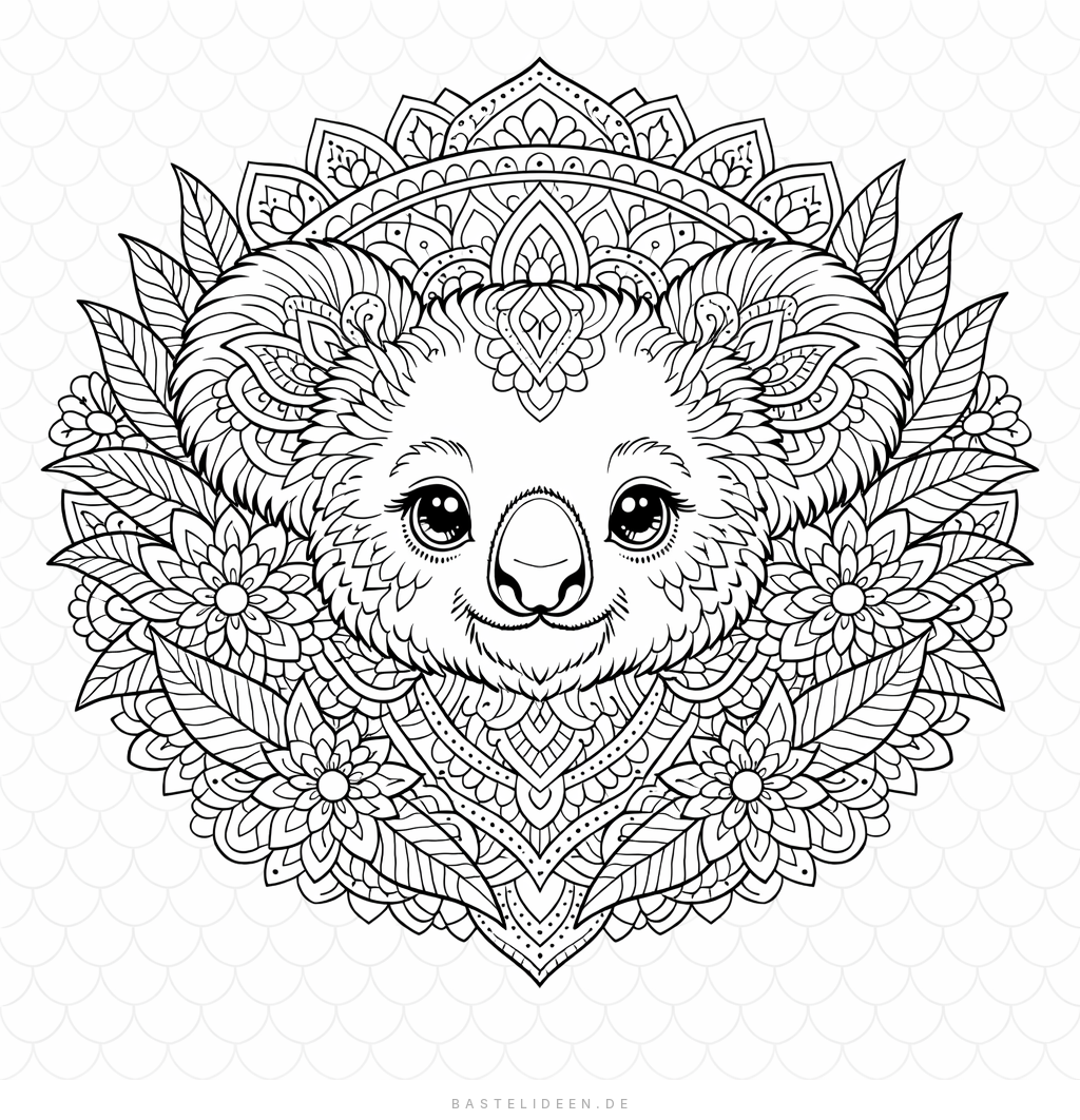 Kunstvolles Koala-Mandala-Ausmalbild mit ornamentalen Eukalyptus-Mustern für Erwachsene.