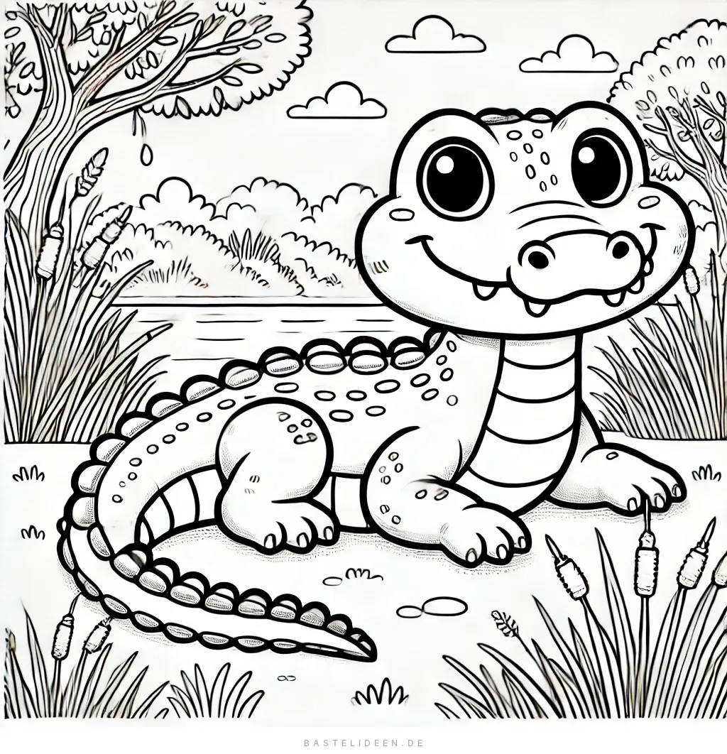 Auf diesem niedlichen Ausmalbild sitzt ein fröhliches Krokodil glücklich am Flussufer, umgeben von üppigen Bäumen und hohen Schilfrohren.