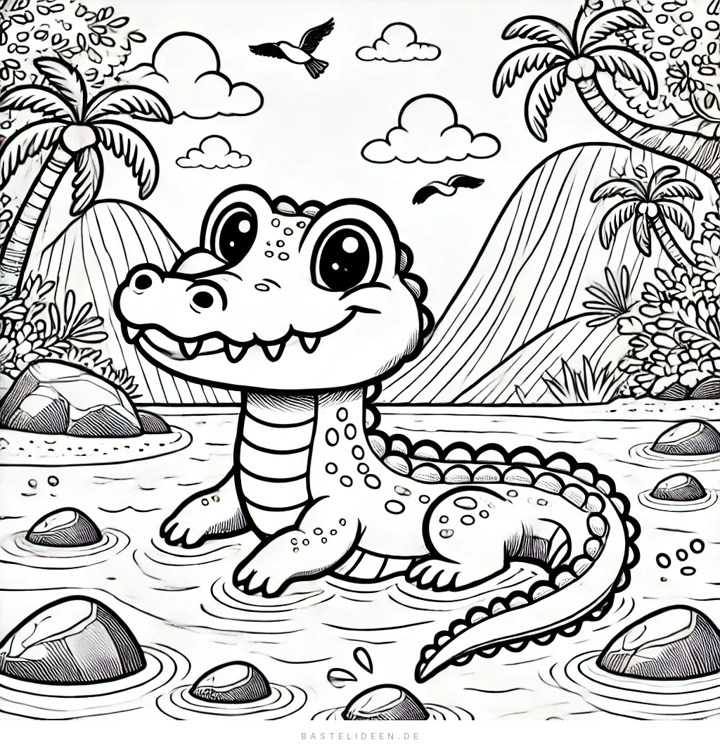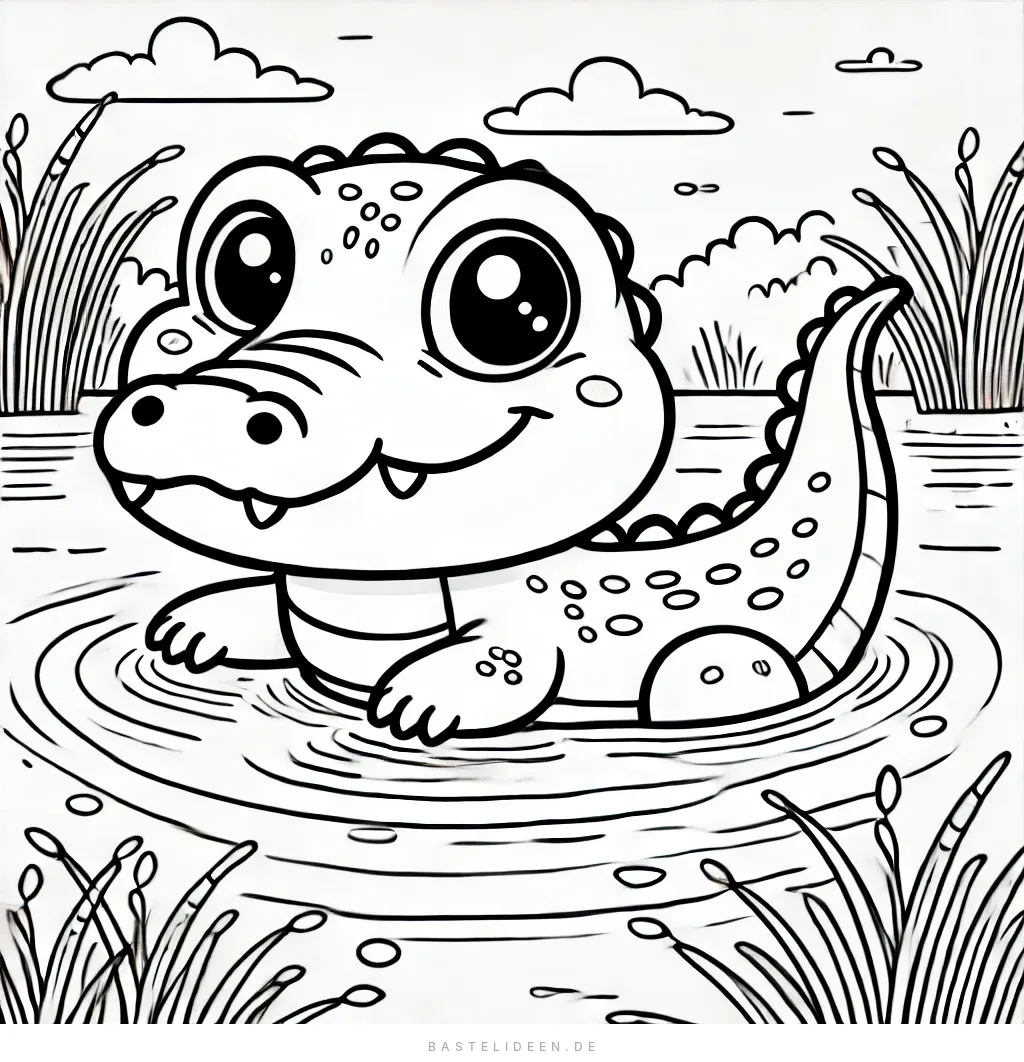 Dieses bezaubernde Ausmalbild zeigt ein verspieltes Krokodil, das einen entspannten Moment im Wasser geniesst.