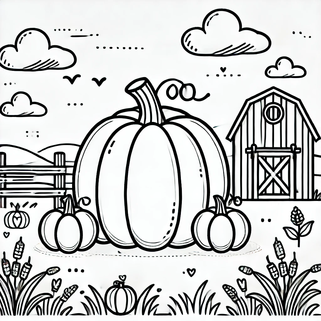 Diese bezaubernde Ausmalvorlage im Bauernhof-Stil zeigt einen großen Kürbis, umgeben von kleineren Kürbissen, einer Scheune und einer malerischen Landschaft. Fluffige Wolken, fliegende Vögel und typische Bauernhofelemente bringen den gemütlichen Charme der Erntezeit perfekt zur Geltung.