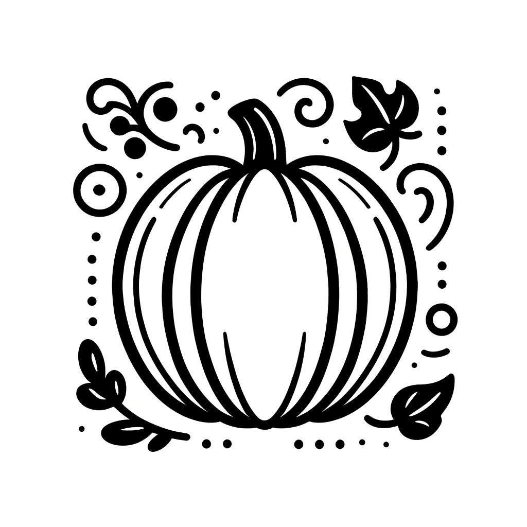 Diese Kürbis-Ausmalvorlage besticht durch ein schlichtes, aber ansprechendes Design, das für alle Altersgruppen geeignet ist. Umgeben von wirbelnden Mustern, Punkten und Herbstblättern fängt die Illustration den Zauber der Herbstzeit perfekt ein.