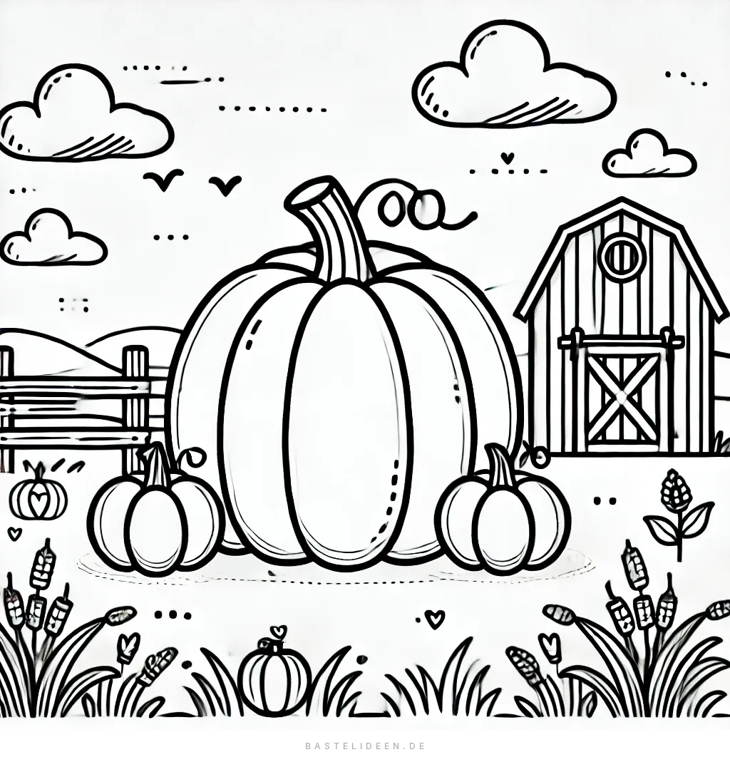 Diese bezaubernde Ausmalvorlage im Bauernhof-Stil zeigt einen großen Kürbis, umgeben von kleineren Kürbissen, einer Scheune und einer malerischen Landschaft. Fluffige Wolken, fliegende Vögel und typische Bauernhofelemente bringen den gemütlichen Charme der Erntezeit perfekt zur Geltung.