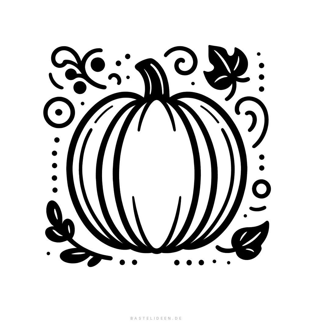 Diese Kürbis-Ausmalvorlage besticht durch ein schlichtes, aber ansprechendes Design, das für alle Altersgruppen geeignet ist. Umgeben von wirbelnden Mustern, Punkten und Herbstblättern fängt die Illustration den Zauber der Herbstzeit perfekt ein.