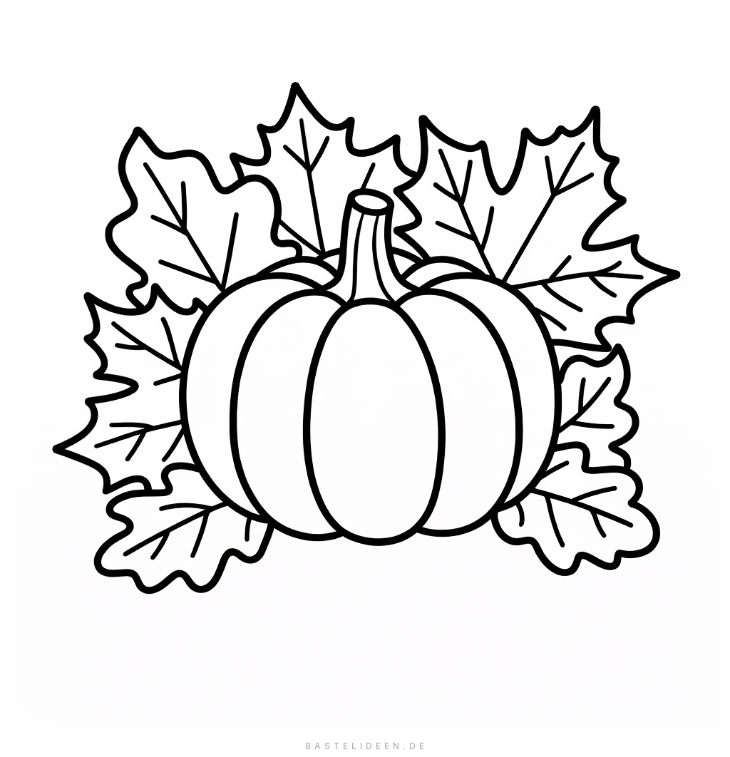 Herbstlicher Kürbis mit einfachen Blattformen zum Ausmalen für Kleinkinder ab 3 Jahren.
