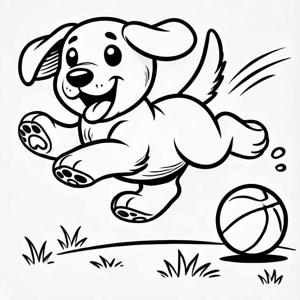 Dieses fröhliche Ausmalbild zeigt einen energiegeladenen Welpen, der voller Freude einem Ball hinterherspringt. Mit fliegenden Ohren und wedelndem Schwanz.