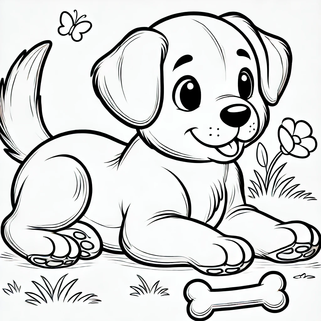 Dieses bezaubernde Ausmalbild zeigt einen verspielten Welpen, der fröhlich daliegt, umgeben von niedlichen Details wie einem Knochen, einem Schmetterling und einer Blume.