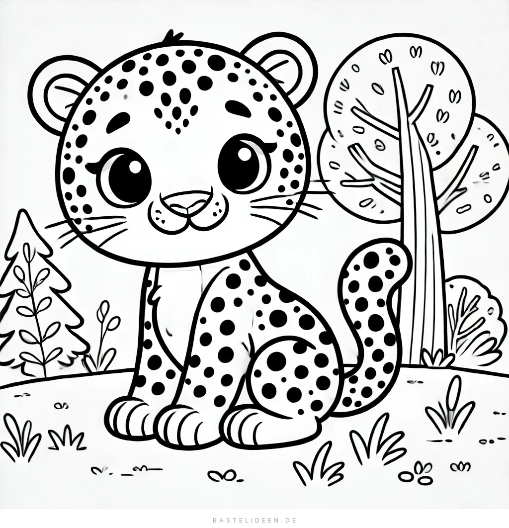 Dieses niedliche Leopard Ausmalbild zeigt einen charmanten Leopard im Cartoon-Stil, der in einem Wald sitzt. Mit seinen großen, runden Augen ist es ideal für Kinder.