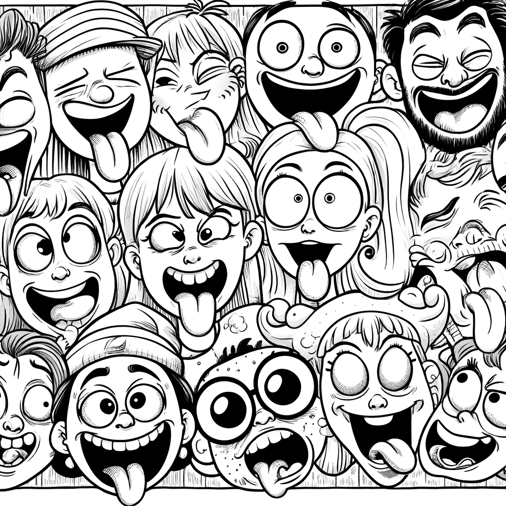 In diesem entzückenden Ausmalbild findest du eine Sammlung von lustigen Gesichtern, die witzige Ausdrücke machen. Von albernen Grinsen bis hin zu verrückten Zungen-Posen.