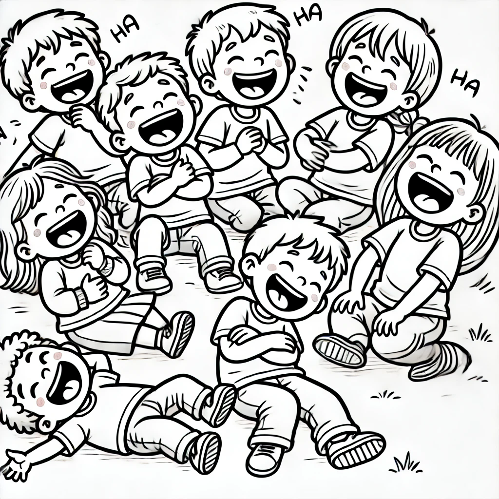 Das Bild zeigt eine Gruppe von Kindern, die zusammen sitzen und herzlich lachen, jeder mit einem großen Lächeln im Gesicht.