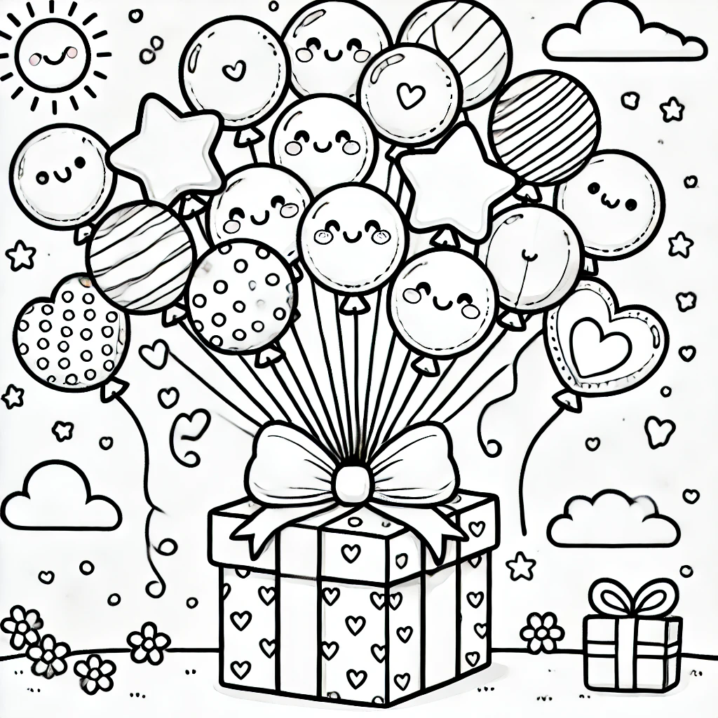Dieses bezaubernde Bild zeigt ein fröhliches Bündel Luftballons, das an einem liebevoll verpackten Geschenk gebunden ist. Umrahmt von Sternen und Herzen.