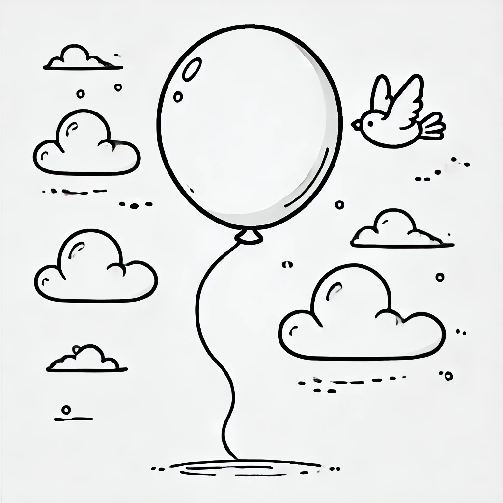 Dieses schlichte, aber beruhigende Bild zeigt die Schönheit eines einsamen Ballons, der friedlich am Himmel schwebt, umgeben von weichen Wolken und einem kleinen Vogel.