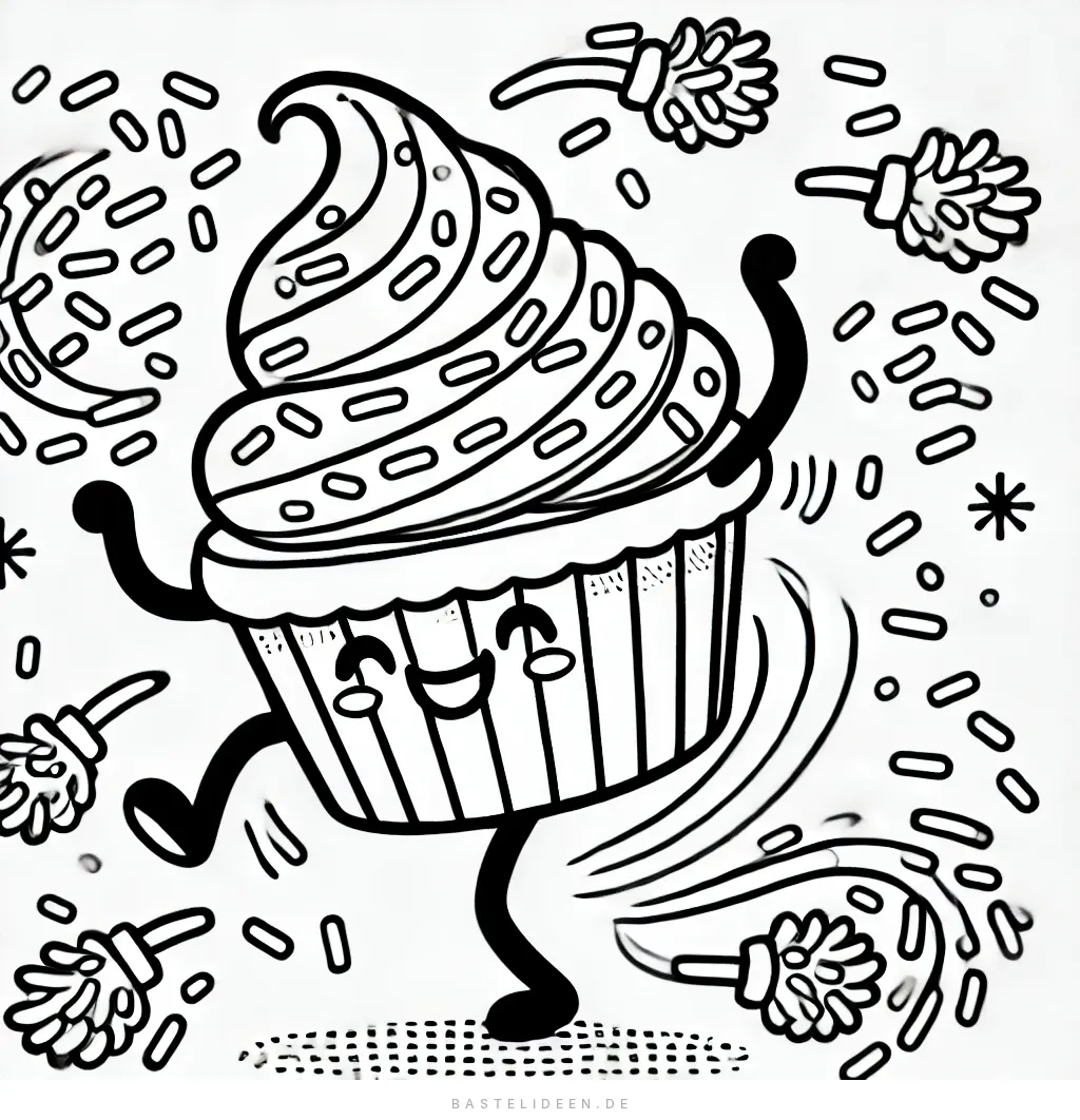 Dieses fröhliche Ausmalbild zeigt einen glücklichen, tanzenden Cupcake mit einer Wirbelhaube aus Zuckerguss und Streuseln.