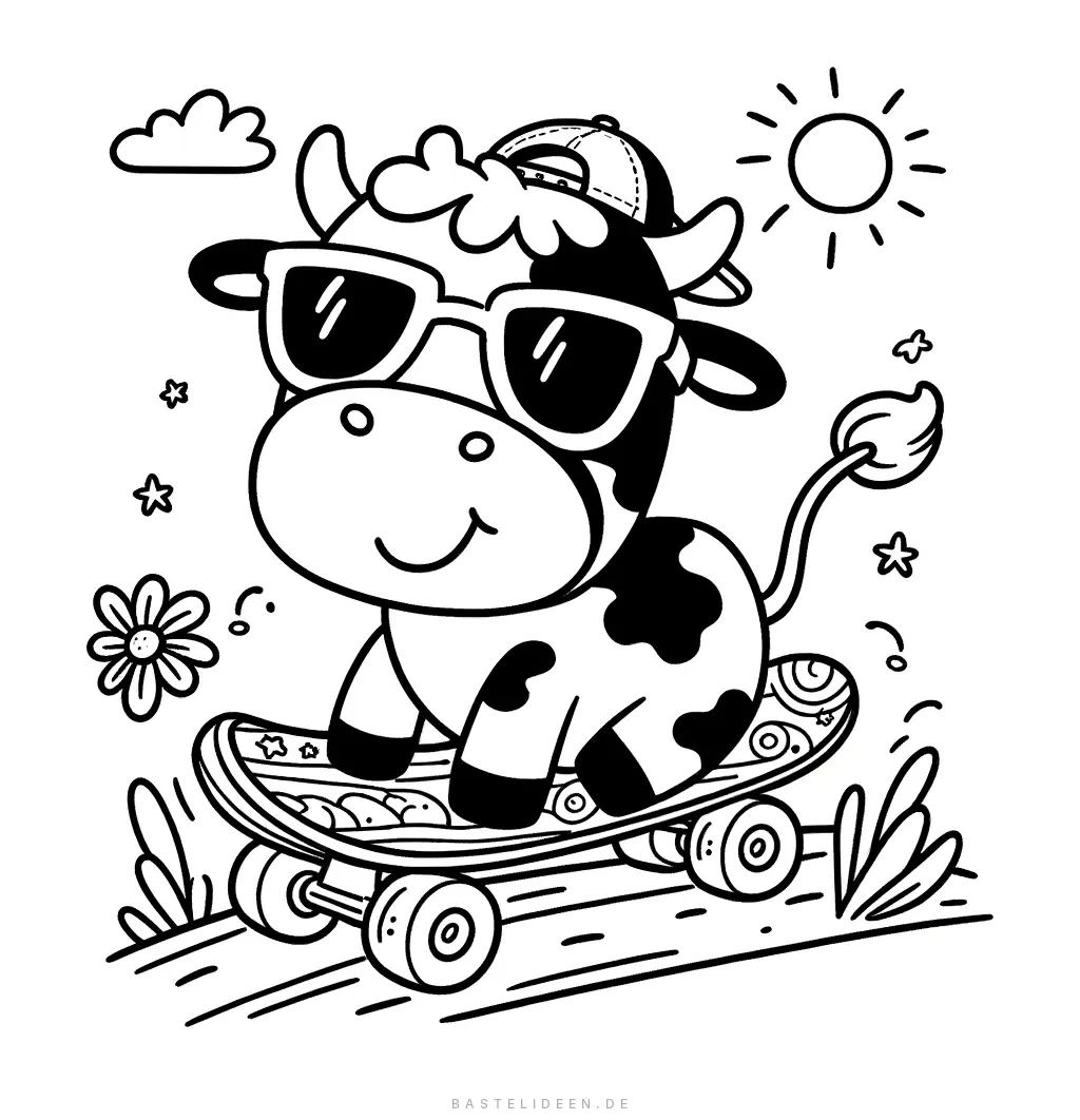 Dieses bezaubernde Bild zeigt eine verspielte Kuh, die auf einem Skateboard unter der strahlenden Sonne fährt. Mit stylisher Sonnenbrille und einer nach hinten gedrehten Kappe.