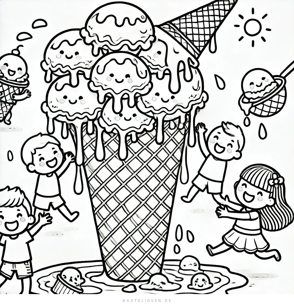 In diesem entzückenden Ausmalbild spielen Kinder fröhlich um eine riesige Eistüte, die mit lächelnden Eiskugeln gestapelt ist.