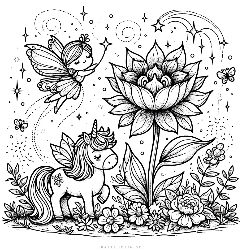 Tauche ein in eine Welt der Fantasie mit diesem bezaubernden Ausmalbild mit Fee und Einhorn! Es zeigt eine verträumte Fee und ein charmantes Einhorn.