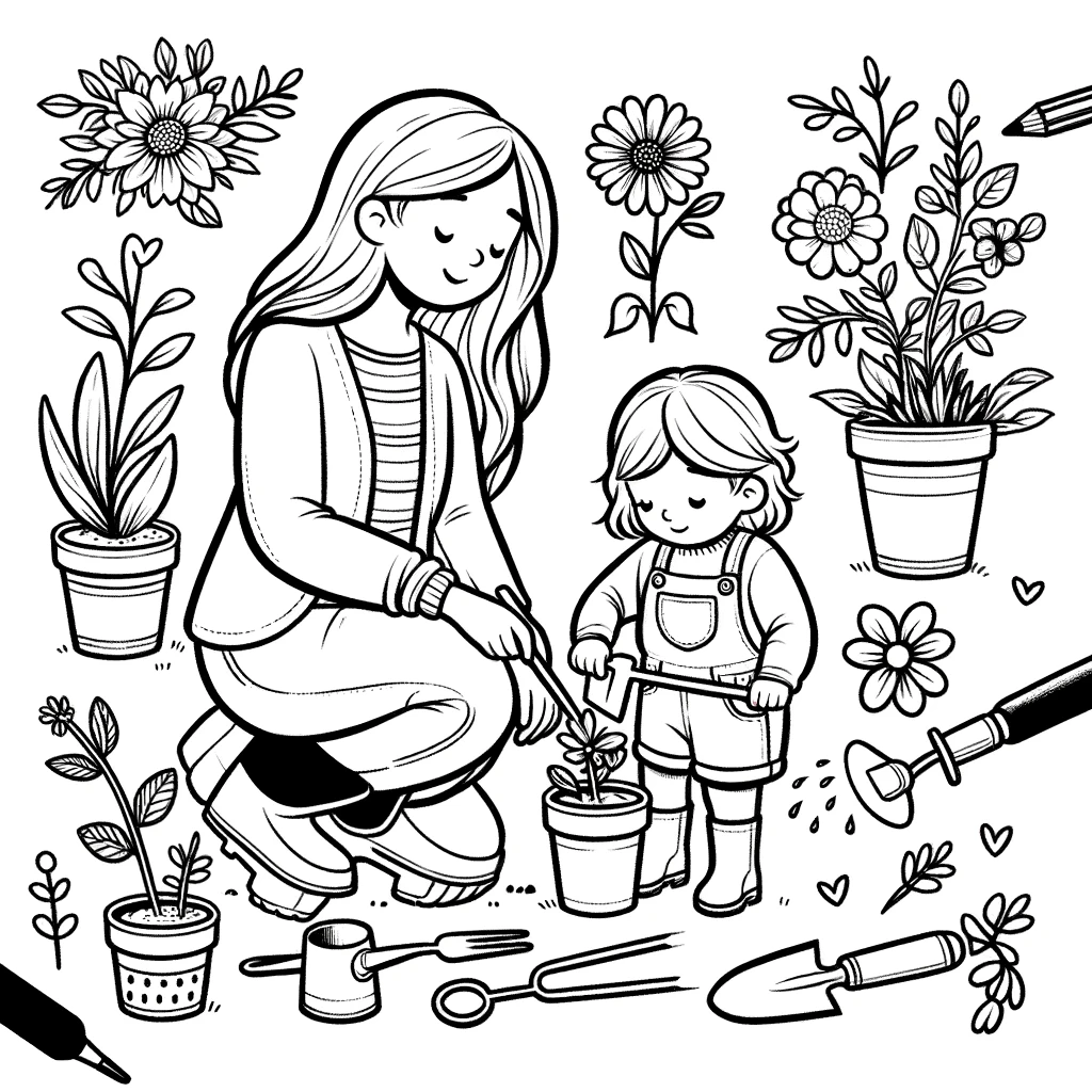 Auf diesem bezaubernden Ausmalbild genießen eine Mutter und ihr Kind gemeinsam eine ruhige Gartenarbeit. Die Szene zeigt, wie die Mutter ihrem Kleinen beim Pflanzen hilft.