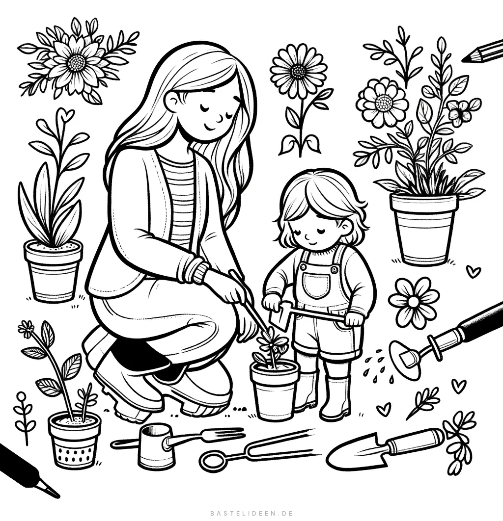 Auf diesem bezaubernden Ausmalbild genießen eine Mutter und ihr Kind gemeinsam eine ruhige Gartenarbeit. Die Szene zeigt, wie die Mutter ihrem Kleinen beim Pflanzen hilft.