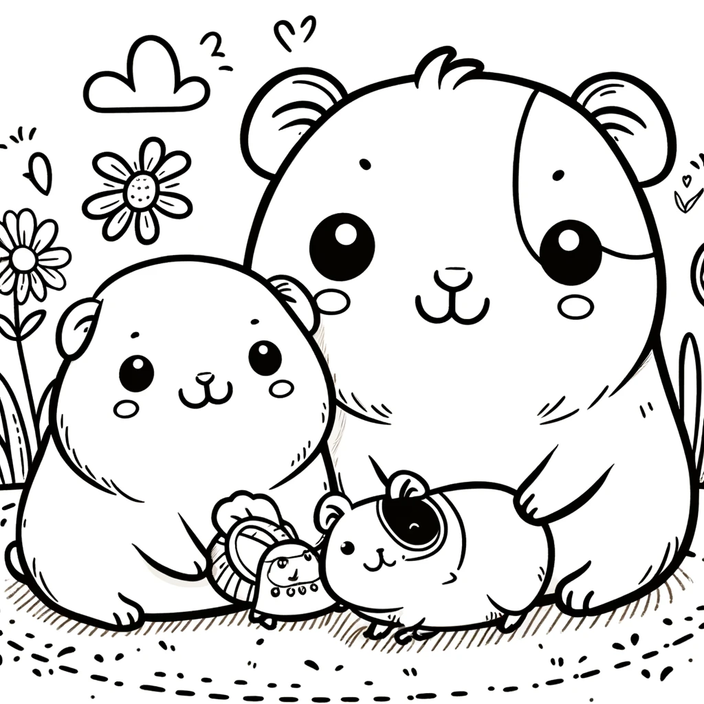 Entzückendes Ausmalbild einer Meerschweinchen-Familie, die einen sonnigen Tag im Freien genießt, mit zwei großen und einem kleinen Meerschweinchen.