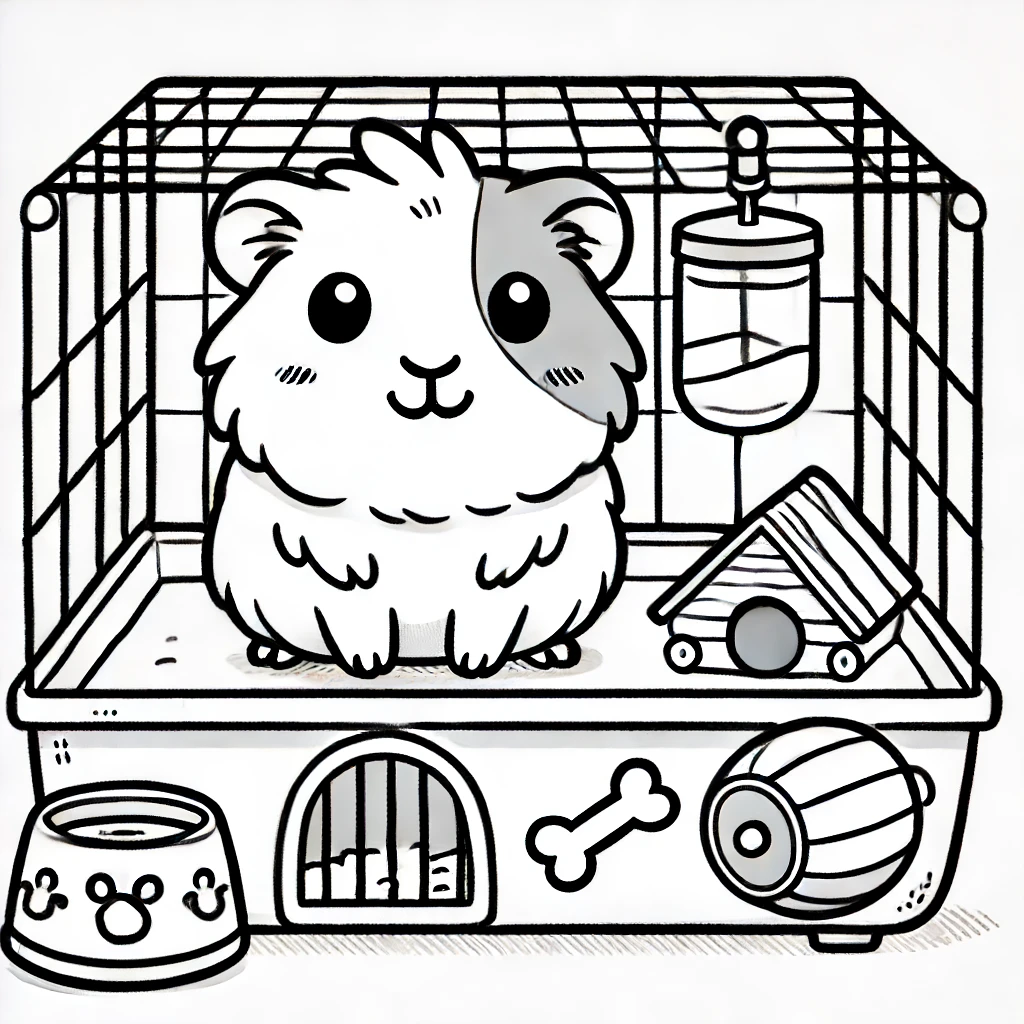 Entzückendes Ausmalbild mit einem Meerschweinchen, das glücklich in seinem Käfig sitzt, ausgestattet mit Wasserflasche, Futternapf und Häuschen.