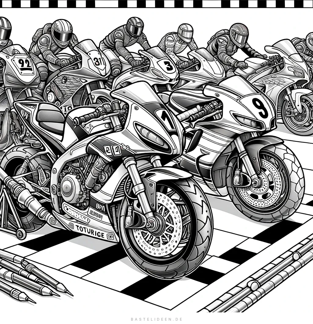 Mach dich bereit fur hochtourigen Spass! Diese actiongeladene Malvorlage zeigt ein intensives Rennen mit schlanken Motorradern und konzentrierten Fahrern.