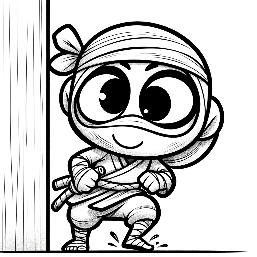 Süsses Ninja-Ausmalbild mit einem verspielten kleinen Ninja, der neugierig hinter einer Wand hervorlugt.