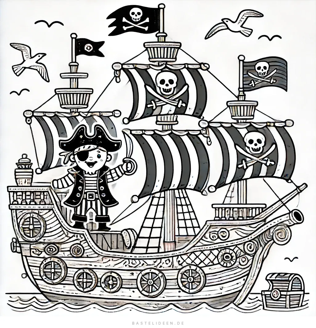 Majestätisches Piratenschiff mit einem jungen Piraten auf dem Deck, wehenden Totenkopfsegeln, Möwen und einer Schatzkiste im Wasser.
