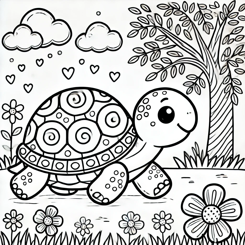 Diese bezaubernde Illustration zeigt eine glückliche Schildkröte, die durch einen mit Blumen gefüllten Garten spaziert, umgeben von Bäumen, Herzen und flauschigen Wolken.
