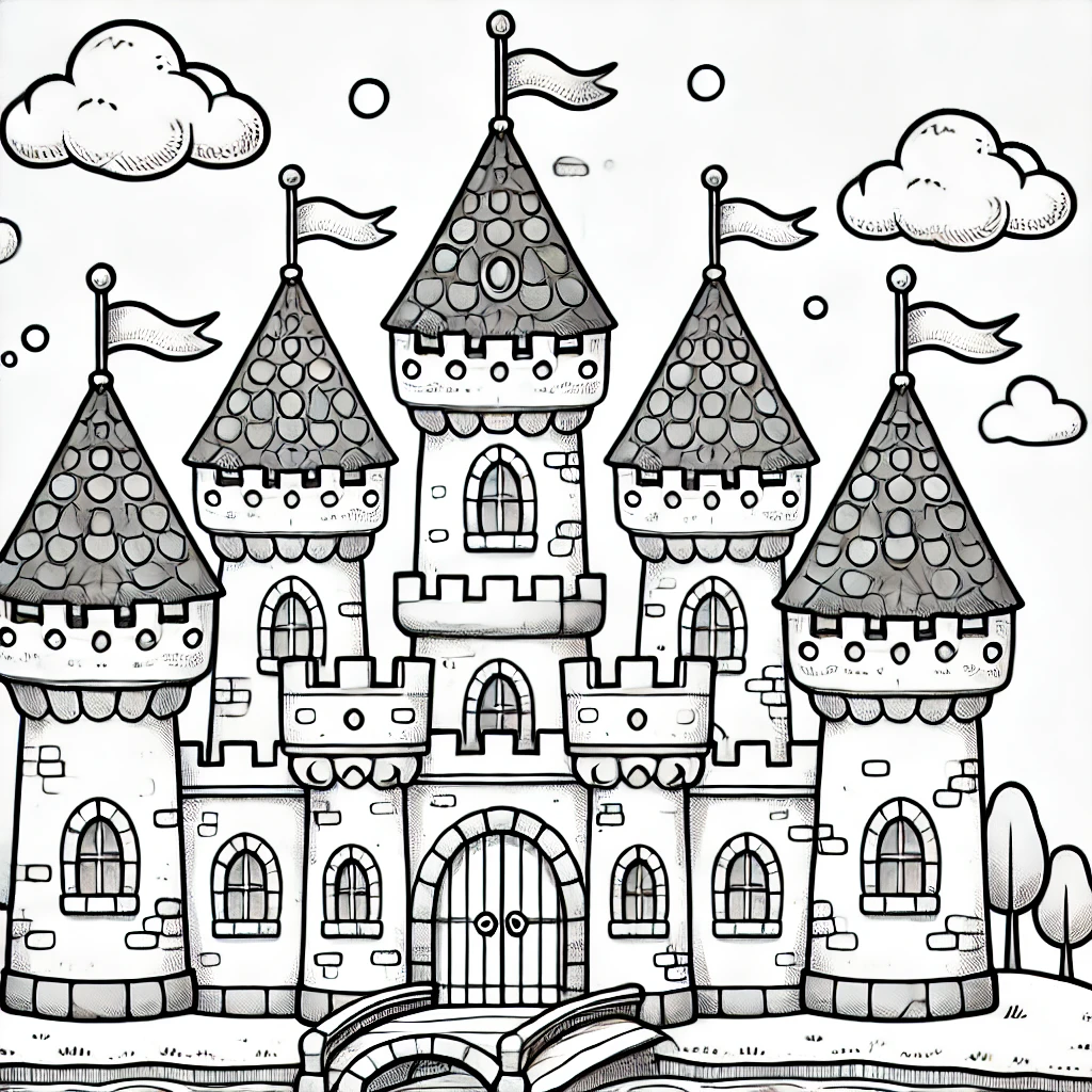 Ein bezauberndes, majestätisches Schloss mit mehreren Türmen, spitzen Zinnen und wehenden Fahnen. Die feinen Details wie die Steinmauerstruktur laden zum kreativen Ausmalen ein.