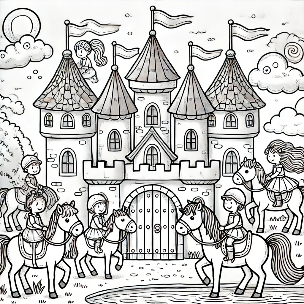 Eine lebendige Szene mit einem prächtigen Schloss, umgeben von Kindern, die auf Ponys reiten. Die fröhlichen Figuren und detaillierten Schlosstürme schaffen eine märchenhafte Atmosphäre.