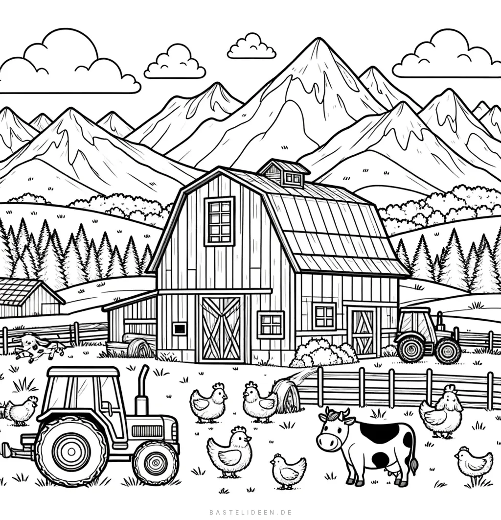 Hier ist eine Malvorlage mit einer Bauernhof- und Bergszenerie, die eine Scheune, einen Traktor und einige Bauernhoftiere vor einer Bergkulisse zeigt.