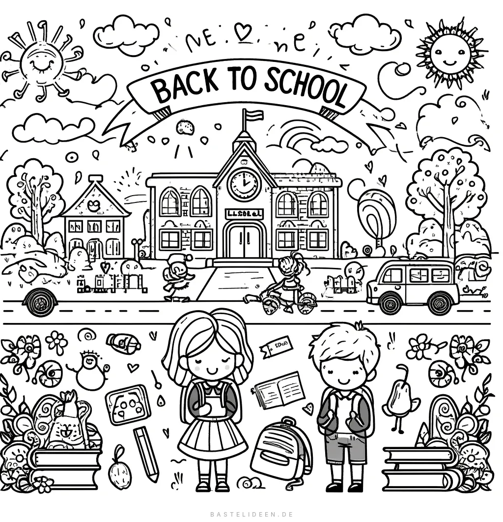 Das beigefügte Bild zeigt eine fröhliche Schulanfang-Szene mit einem lebhaften Schulgebäude, glücklichen Kindern und verschiedenen Schulelementen.