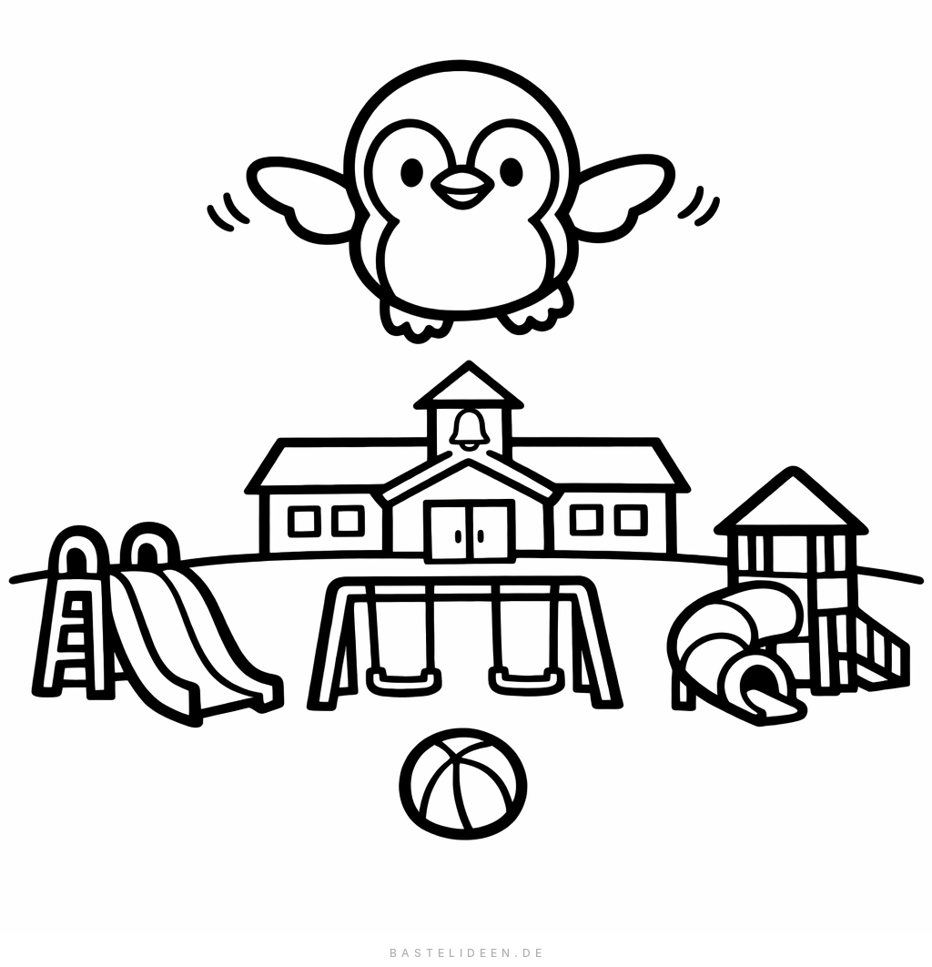 Einfaches Ausmalbild mit einem süßen fliegenden Pinguin über dem Schulhof.