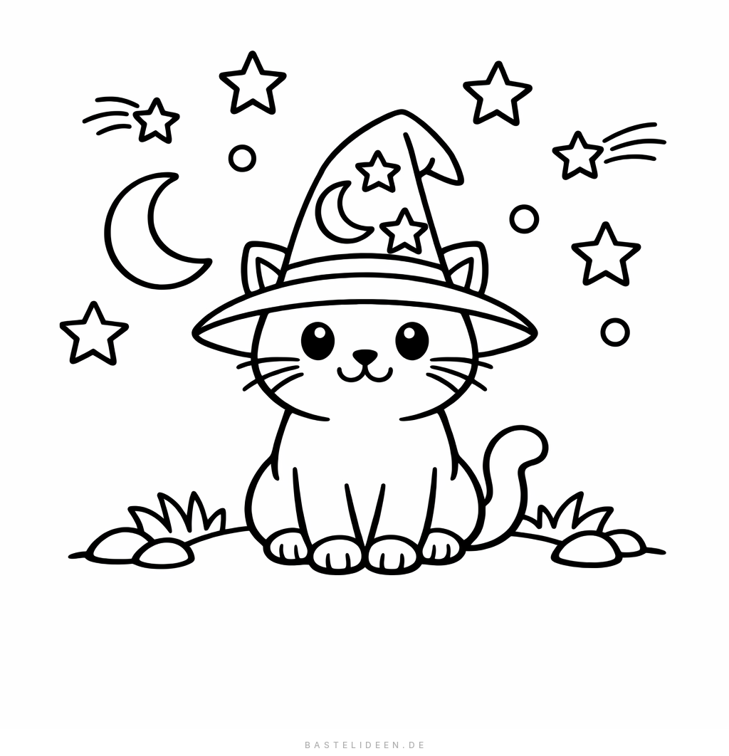 Ausmalbild mit einer Katze mit spitzem Zauberhut unter einem funkelnden Sternenhimmel.