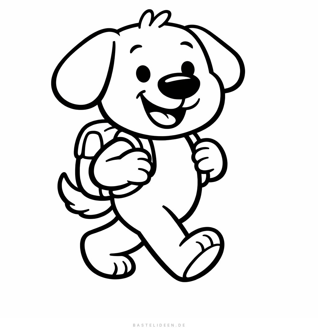 Einfaches Ausmalbild mit einem fröhlichen Hund, der einen Schulranzen trägt.