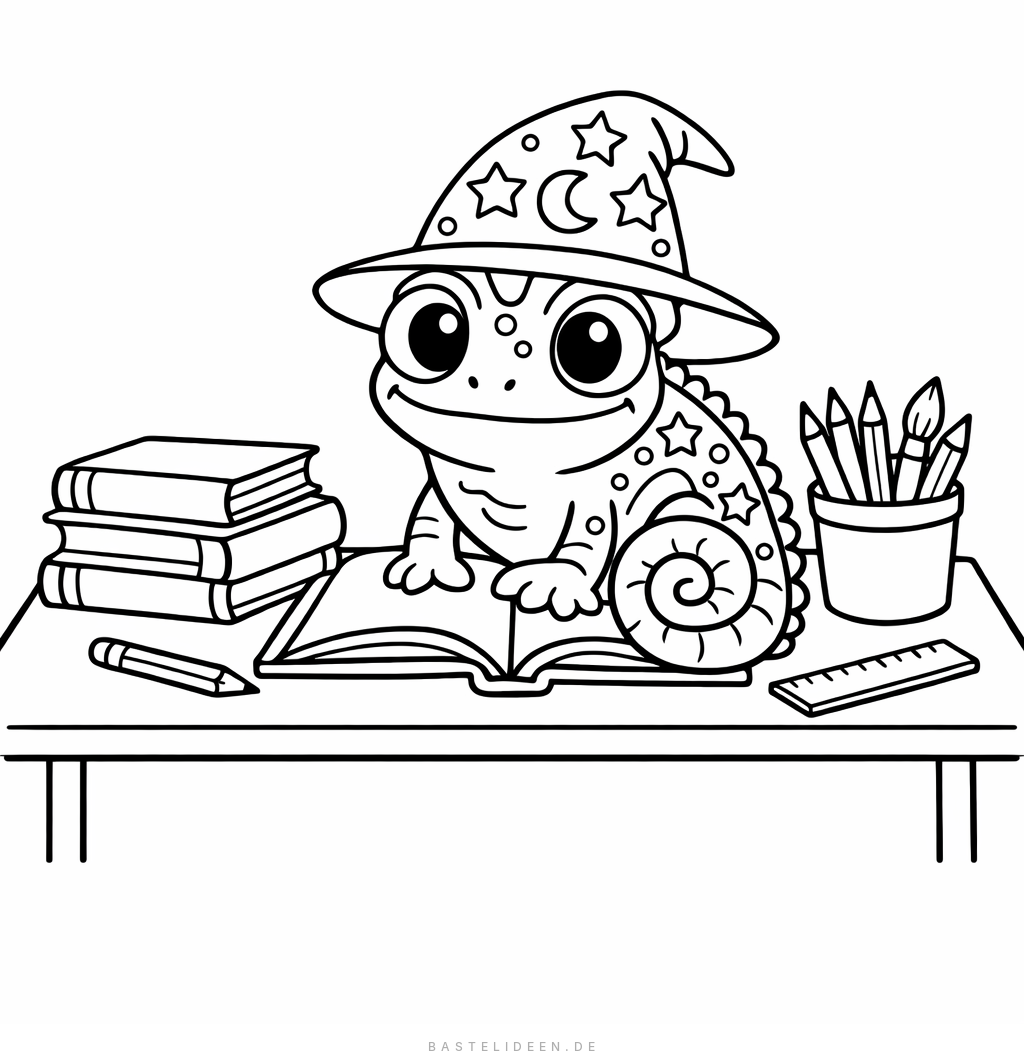 Ausmalbild mit einem magischen Chamäleon, das auf einem Pult im Klassenzimmer sitzt.