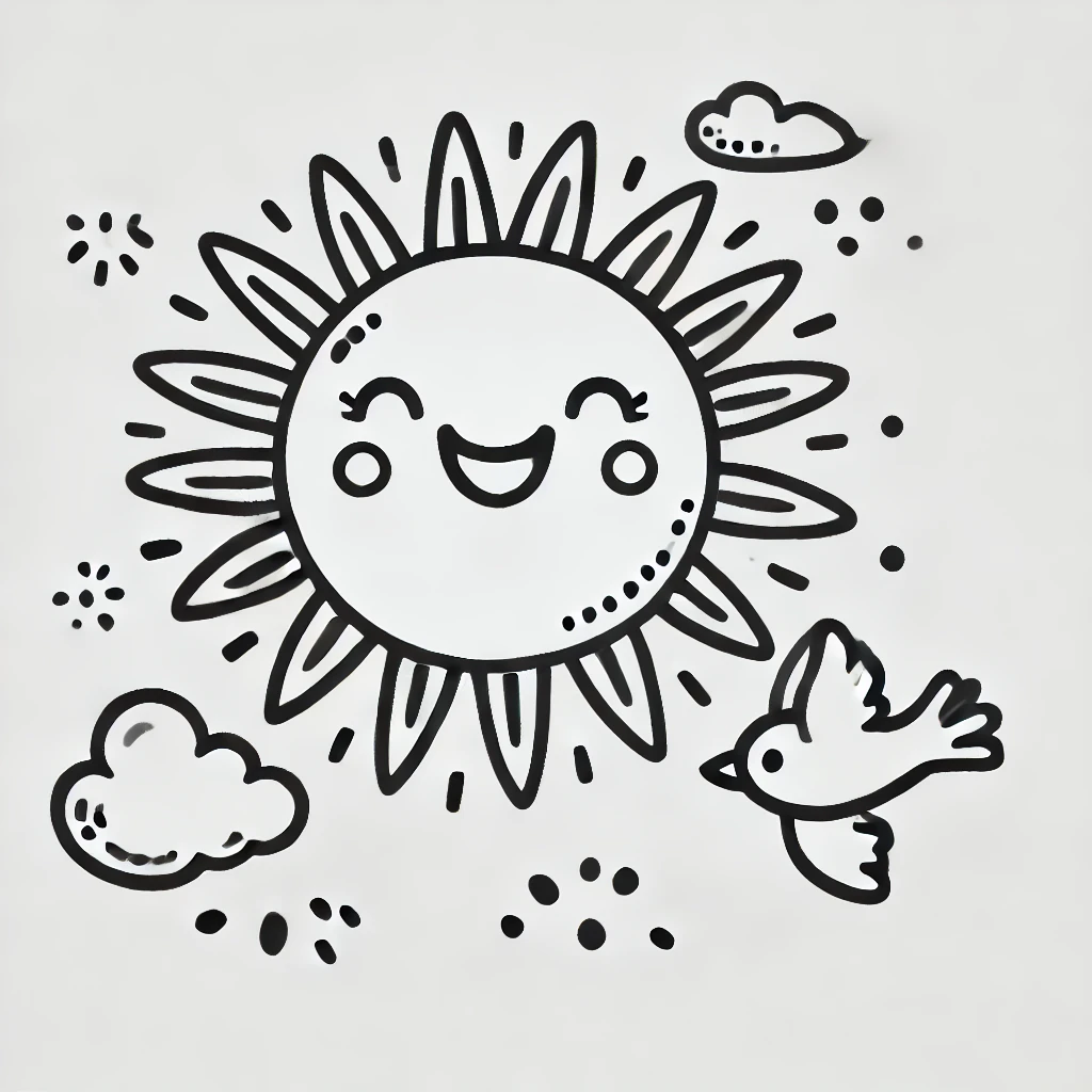 In diesem fröhlichen Sonne Ausmalbild strahlt eine lächelnde Sonne, deren leuchtende Strahlen Freude verbreiten. Umgeben von fluffigen Wolken und einem niedlichen Vogel, der vorbeifliegt, schafft dieses Bild eine friedliche und glückliche Atmosphäre.
