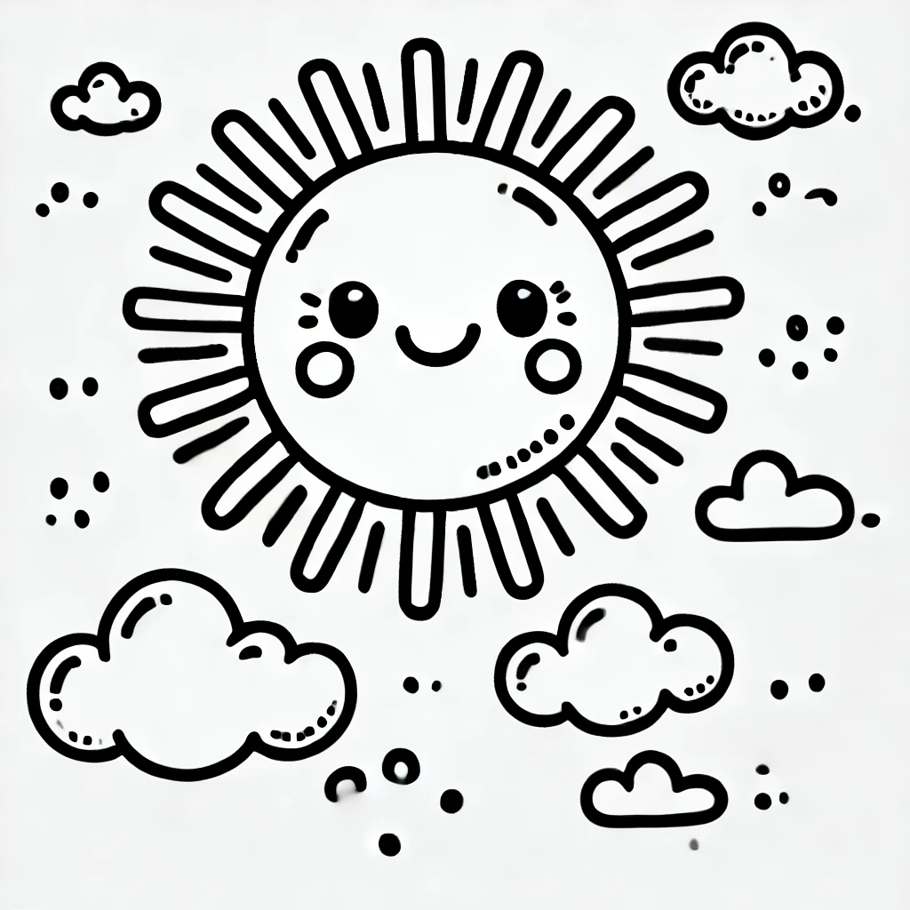In diesem bezaubernden Sonne Ausmalbild strahlt eine fröhlich lächelnde Sonne, umgeben von sanften Wolken, die ruhig am Himmel schweben.