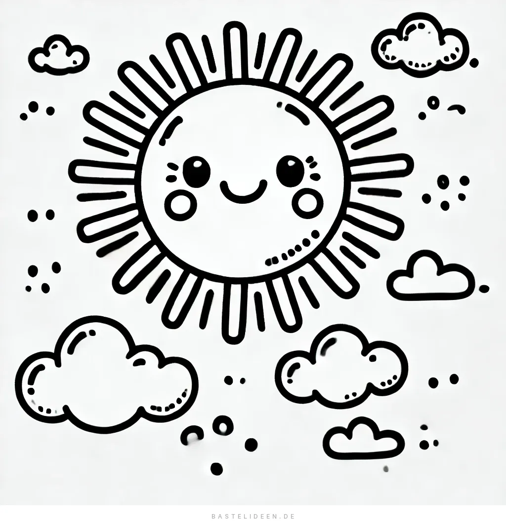 In diesem bezaubernden Sonne Ausmalbild strahlt eine fröhlich lächelnde Sonne, umgeben von sanften Wolken, die ruhig am Himmel schweben.