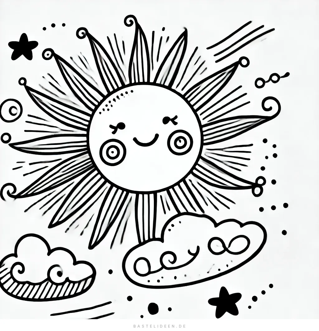 Dieses Sonne Ausmalbild zeigt eine fröhliche Sonne mit geschwungenen Strahlen, die von spielerischen Wolken und Sternen umgeben ist.