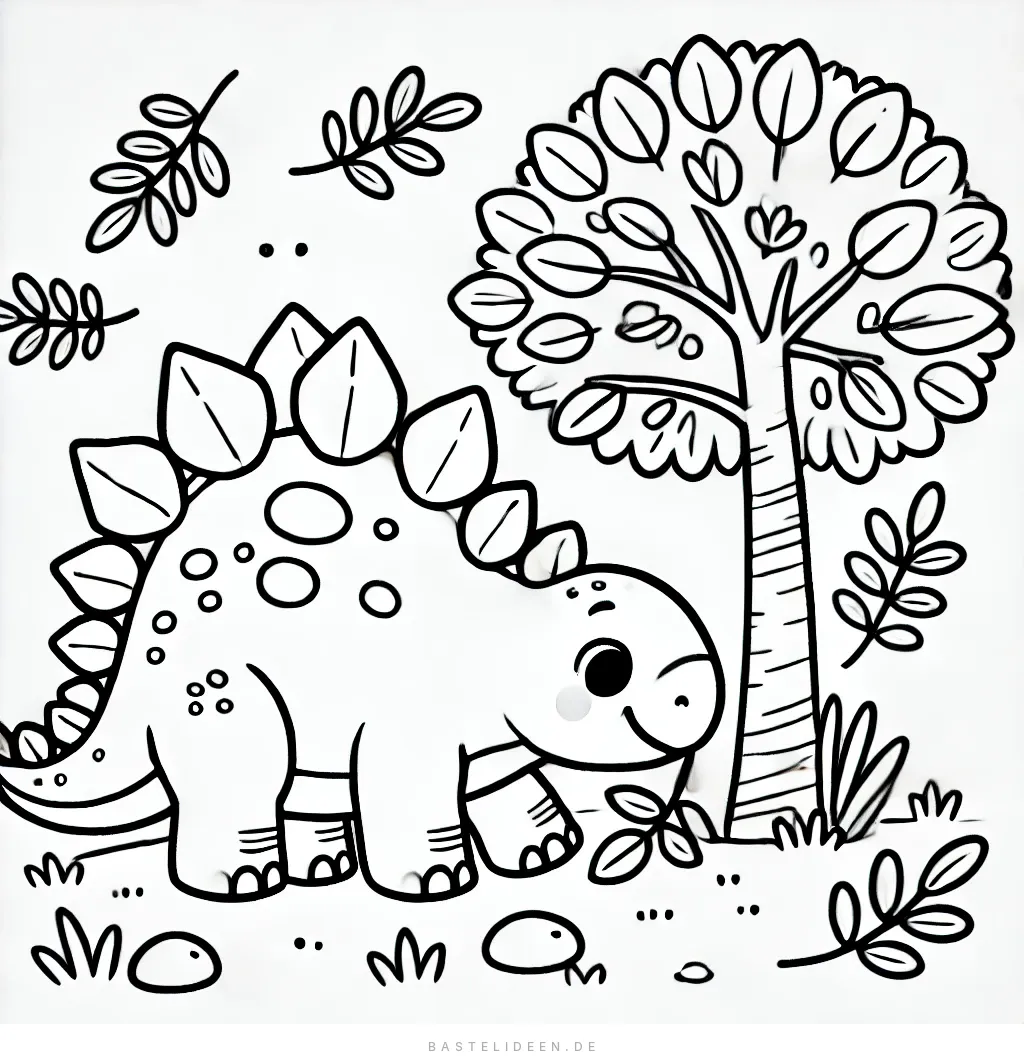 Auf dieser niedlichen Malvorlage spaziert ein fröhlicher Stegosaurus neben einem großen Baum, umgeben von kleinen Pflanzen und Steinen. Mit seinem süßen Lächeln und verspielten Design lädt diese Szene dazu ein, mit bunten Farben gefüllt zu werden.