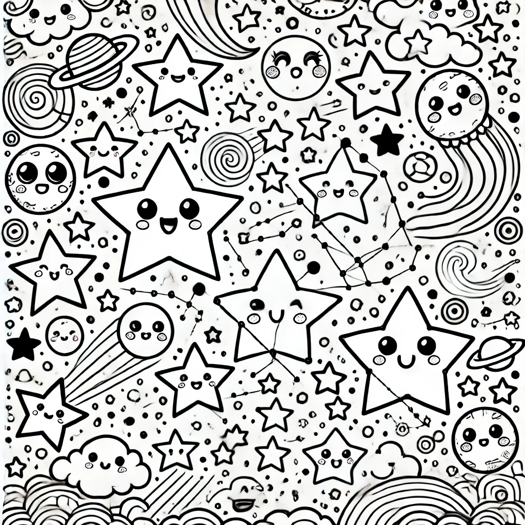 Diese bezaubernde Ausmalseite ist voller süßer, lächelnder Sterne, verträumter Wolken und eines Halbmondes. Jeder Stern hat ein niedliches Gesicht und lädt dazu ein, beim Ausmalen kreativ zu werden.
